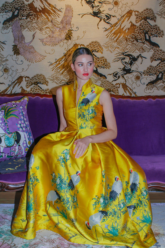 The Royal Yellow Crane Dress is a radiant celebration of heritage and elegance, drawing inspiration from the grandeur of imperial China. Crafted in a luminous jacquard fabric, the dress glows in a regal shade of yellow—a colour historically reserved for royalty, symbolising power, honour, and divine favour.