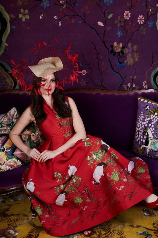 This dress reimagines a classic ‘50s silhouette with an intricate Crane pattern that makes the birds appear lifelike as the fabric moves. Each bird peaks out from behind the pleats as the fabric swirls, while the high collar is a subtle nod to the traditional dragon robes.
